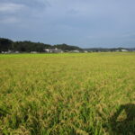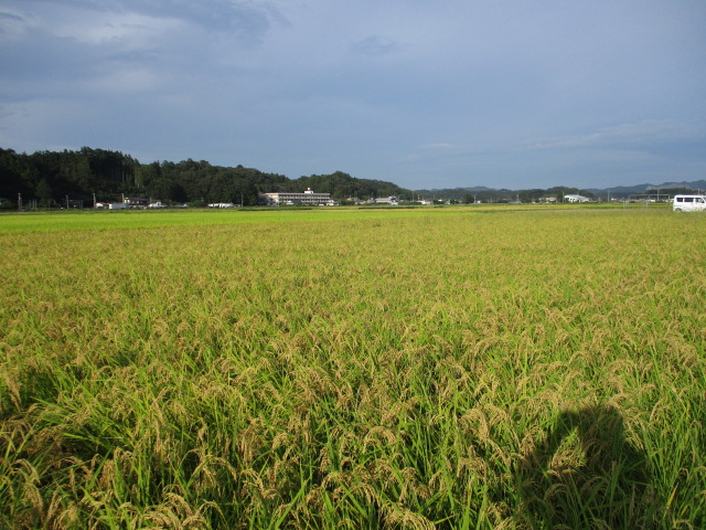 第5回の生育調査では緑色が強かった学習田は、穂の1粒1粒に栄養をたっぷりと溜め込み、粒の重さで稲は首(こうべ)を垂れるように曲がっていました。