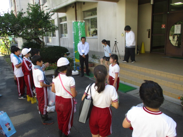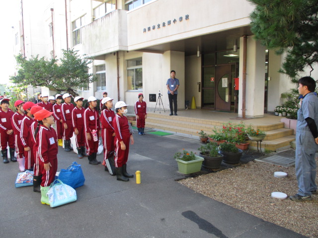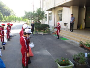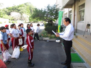校長先生より激励をいただき、自分たちで田植えをした田んぼに向かいます。