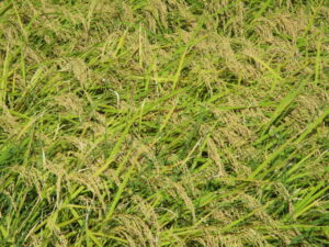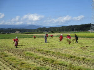 乾燥させるため、脱穀した後の稲わらを投げて田んぼ全体に散らしました。