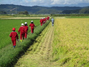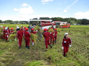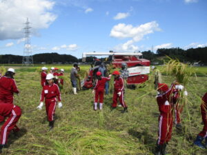 鎌を手に取り、農協青年部の指導を受けながら刈り取っていきました。