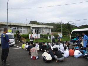 田んぼアート横の交流田に到着、実行委員より刈り方を実演していただきました。