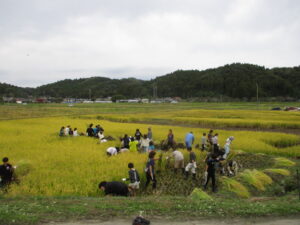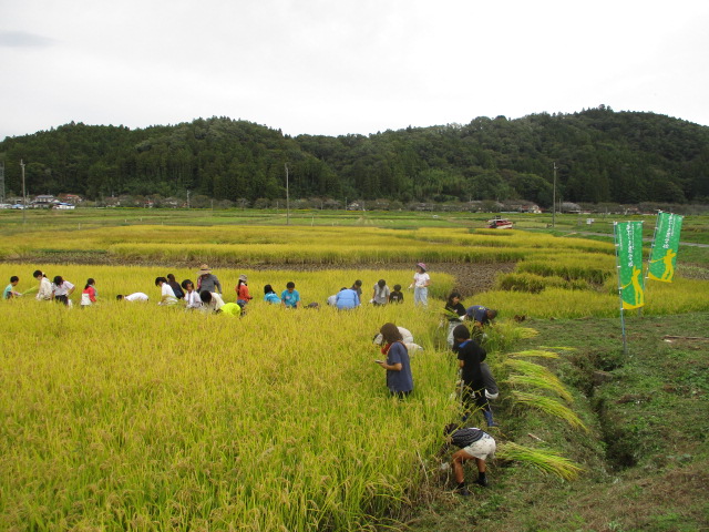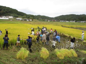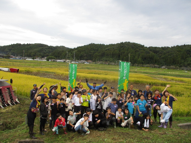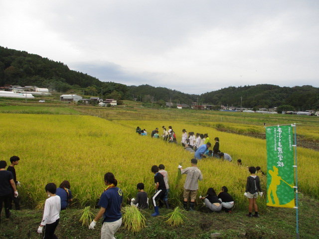 10月18日(土)に西根地区田んぼアート交流田にて、目黒区立月光原小学校の児童及び保護者、北郷小学校と北角田中学校の有志合わせて57名で、稲刈り体験交流事業が行われました。