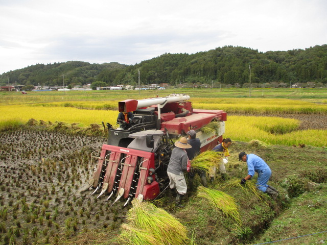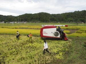 刈り取った稲を脱穀、残った稲わらは乾燥させるために田んぼに散らしました。