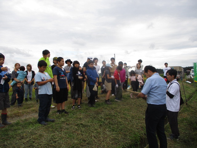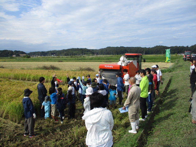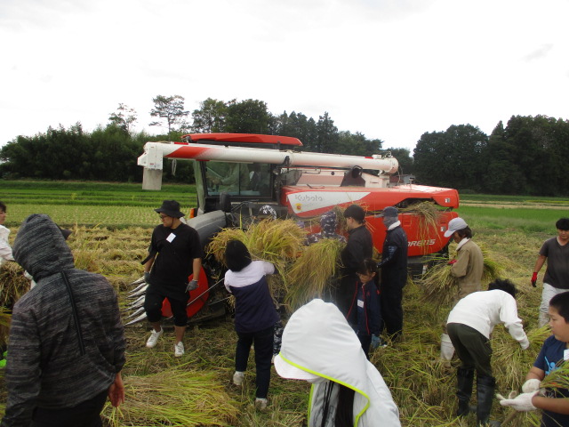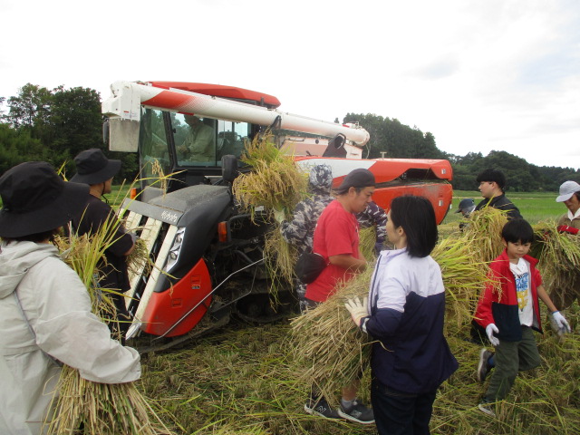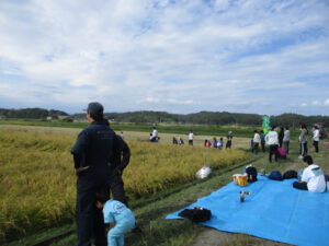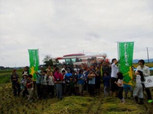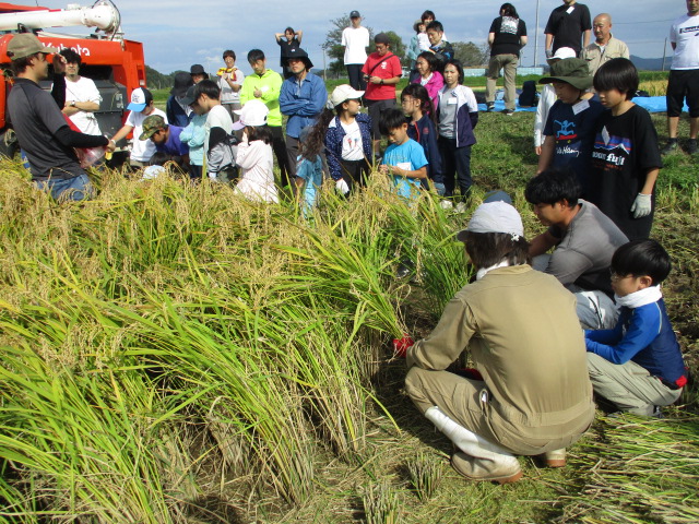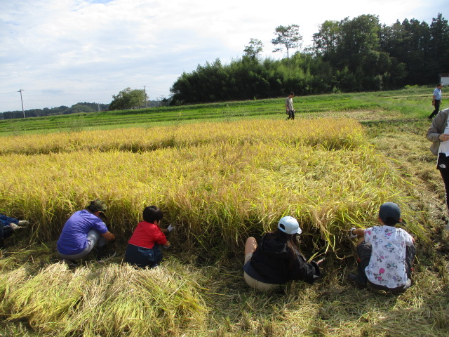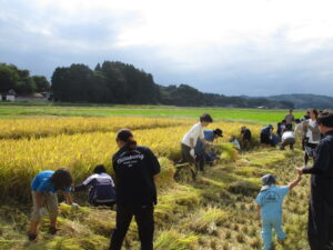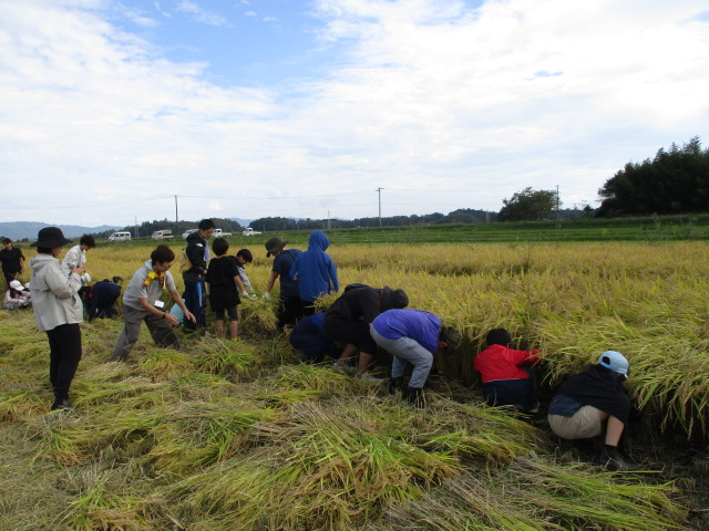 絆交流田では10月4日(土)に、目黒区立緑ヶ丘小学校児童保護者と北郷小学校有志併せて43名で、角田絆交流事業の稲刈り体験が行われました。