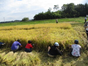 春に自分たちが植えた苗を、鎌を使って刈り取っていきます。