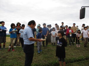 稲刈り体験証の授与式は、交流田の前で行いました。
